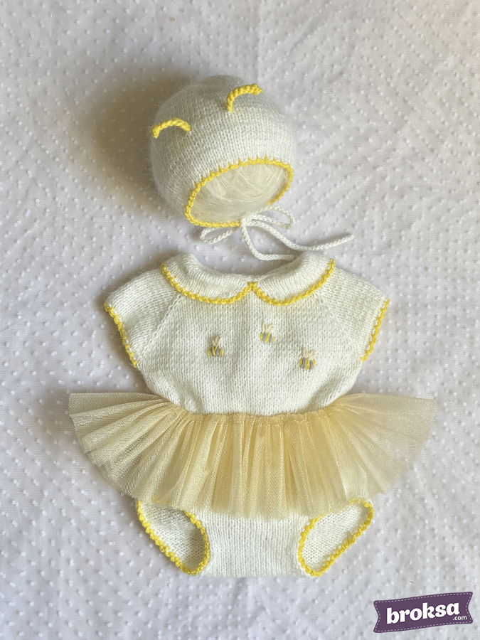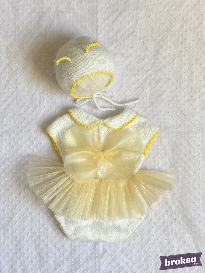 Creé este conjunto como un suspiro de una mañana cálida: una tela crema abraza la piel con suavidad, y reflejos amarillo limón añaden luz a cada rasgo del bebé. Un cuello redondo con un borde de malla amarillo, pequeños toques bordados en el pecho y una falda ligera de tul vainilla forman la silueta de una pequeña hada. En la espalda, alas hechas de la misma tela suave, que convierten cada movimiento en una toma festiva. Un bonito bonnet con bigotes amarillos y lazos delicados cierra el look — delicado, soleado y verdaderamente original.
