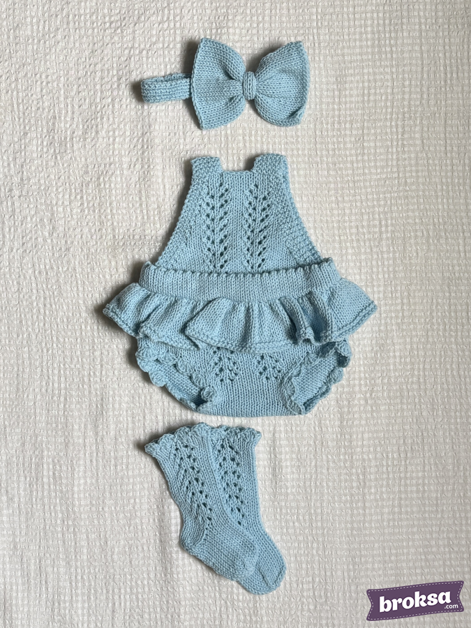 Propongo un conjunto elegante para una muñeca reborn en un tono azul celeste. El elemento central es un mameluco-pañal con paneles de encaje en la parte delantera, adornado con un suave volante que modela delicadamente la silueta. Los bordes curvados en las piernas y proporciones cuidadosamente equilibradas garantizan un ajuste impecable, y una cinta con un lazo grande añade un toque de lujo discreto. Medias de encaje con un borde ondulado completan el conjunto, creando un aspecto premium. Textura suave al tacto y bordes elásticos aseguran comodidad y un ajuste preciso sin arrugas. Este es precisamente la ropa exclusiva para muñecas reborn, que resalta la alta maestría y un gusto refinado.