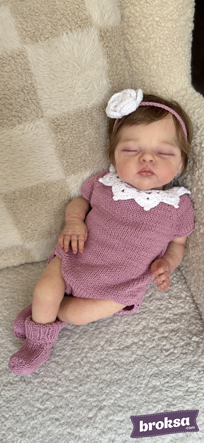 En mis manos nació un conjunto tejido para una muñeca reborn de colección. Body en tono empolvado con cuello de encaje blanco níveo, botones transparentes en la espalda, calcetines suaves y diadema con flor. La textura es suave y agradable al tacto. La atención al detalle se percibe en cada puntada; el conjunto luce delicado y elegante: una solución lista para sesiones de fotos y exposiciones.