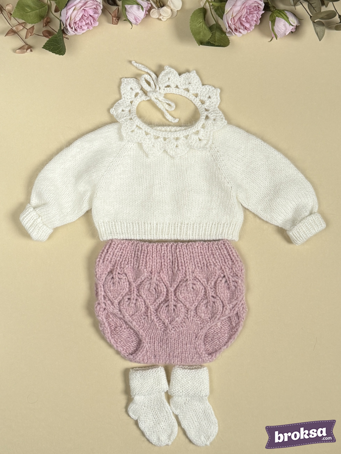 Ofrezco un conjunto tejido para una muñeca reborn. Jersey blanco leche con canalé suave y cuello de encaje desmontable. Pololos rosa empolvado con dibujo en relieve, calcetines blancos. El ajuste está pensado al milímetro; queda pulcro y elegante. La atención al detalle se nota en los bordes limpios y la simetría del motivo.