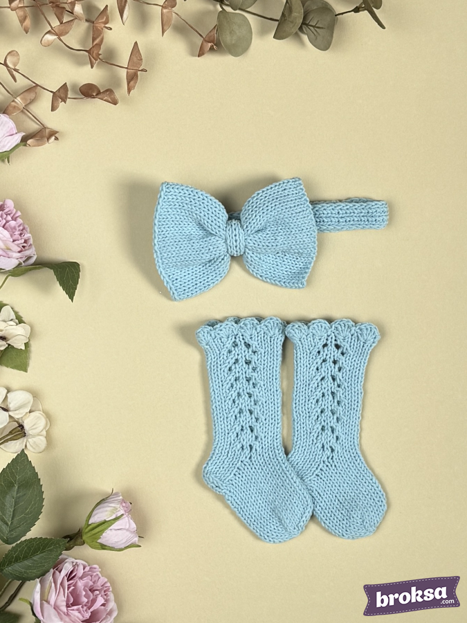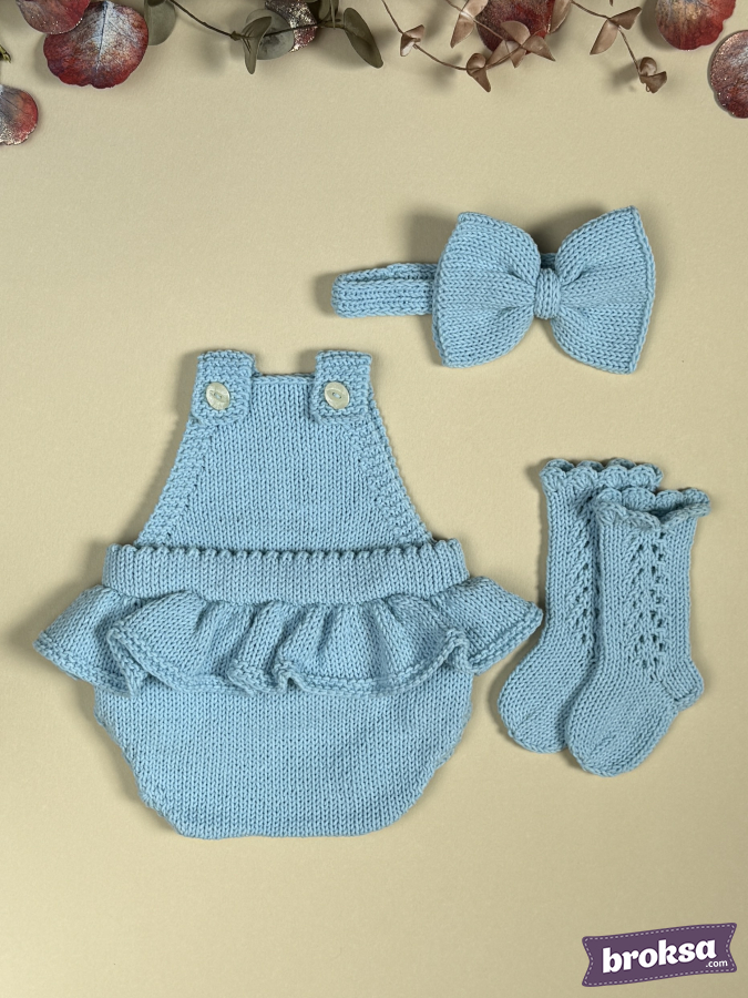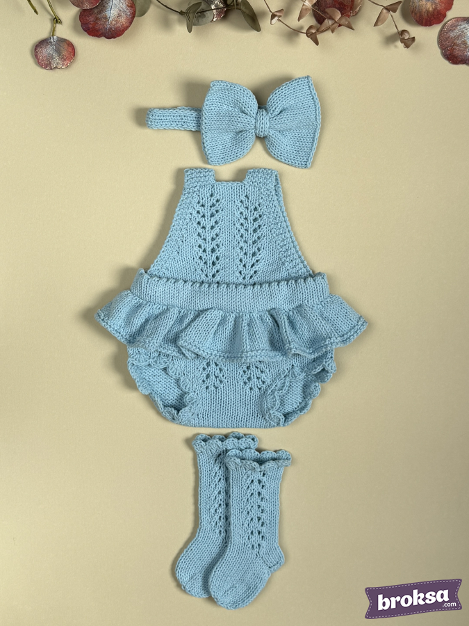 Conjunto tejido en azul claro para muñeca reborn. Pelele con volante, calcetines altos calados y diadema ancha con lazo. Textura de algodón suave, puntadas uniformes y bordes prolijos: la maestría se percibe a primera vista. Ajusta a la perfección y realza las proporciones de la muñeca. El tono sereno luce expresivo en foto y en vitrina.
