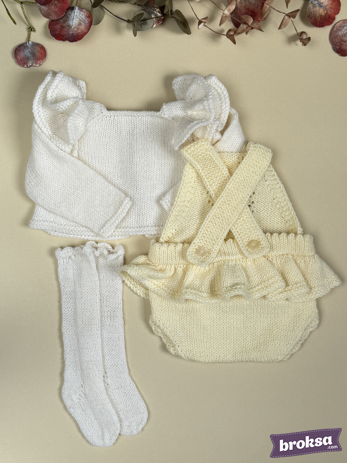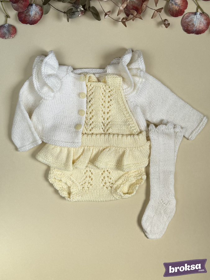 Incluye: cárdigan abotonado, ranita calada con volante y tirantes cruzados, medias.