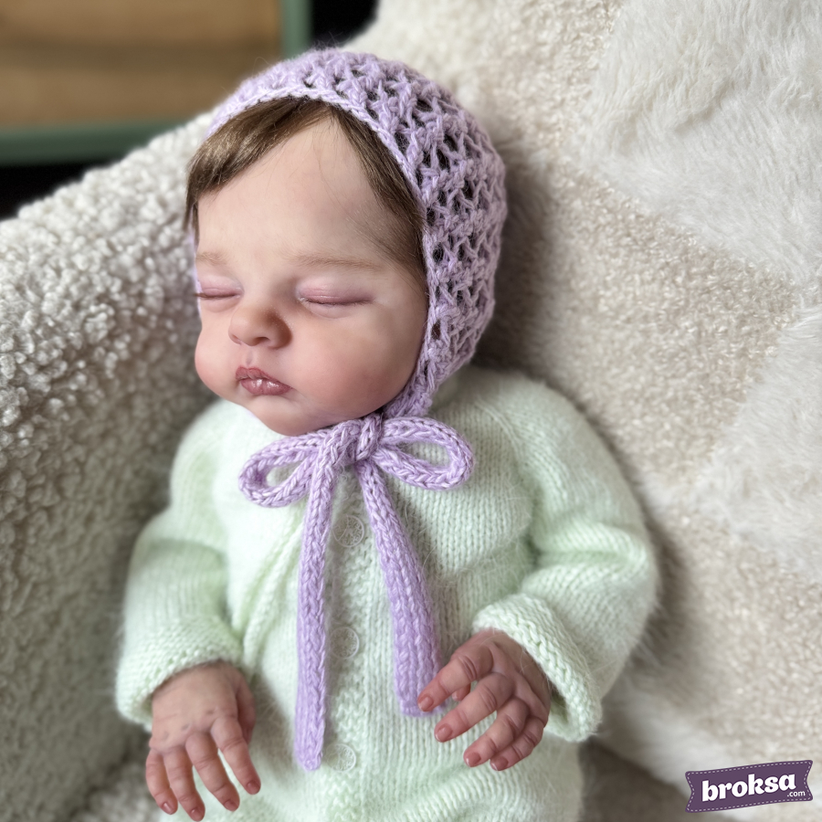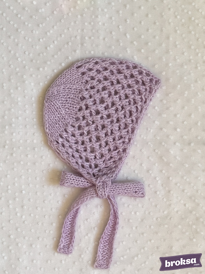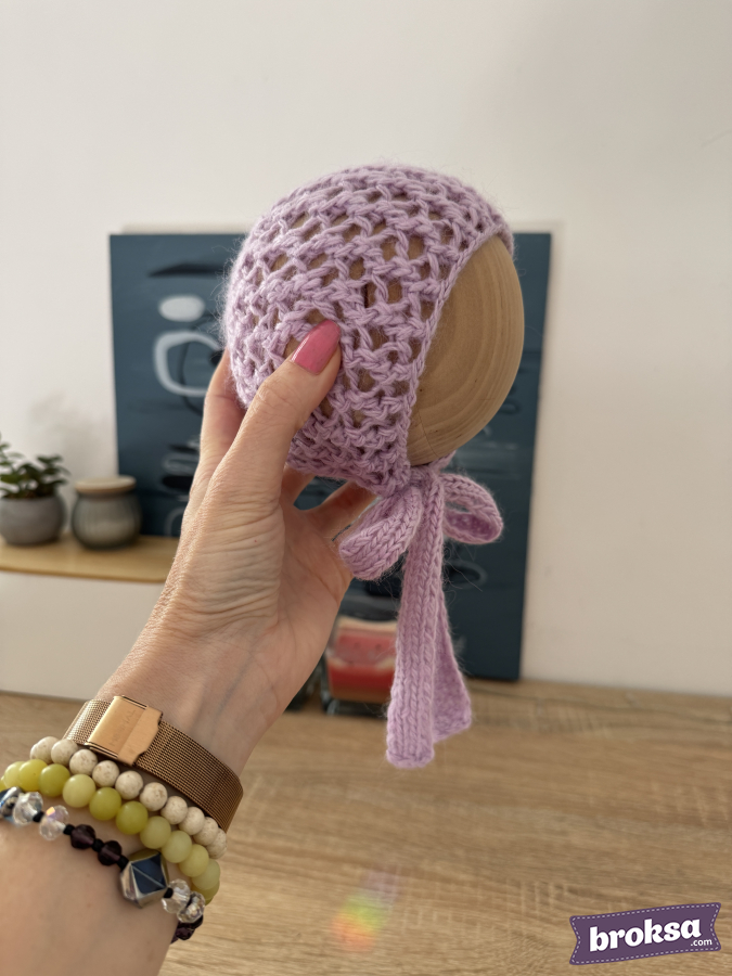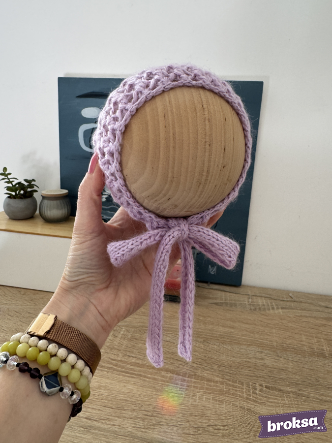 Propongo una capota tejida color lavanda para muñecas reborn. La malla calada envuelve suavemente la cabeza y las cintas anchas forman un lazo bonito. El hilo es suave al tacto. Un acento refinado para fotos y para tu colección.