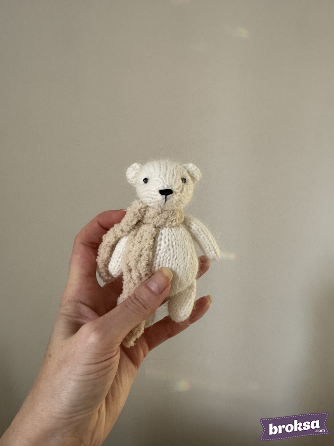 Presento un osito mini de tono crema con una bufanda beige esponjosa. Es un juguete tejido para sesiones de fotos, que luce armonioso junto a un bebé y una muñeca reborn. Tejido fino y prolijo, textura suave, cuerpo elástico. Altura ideal para el encuadre.
