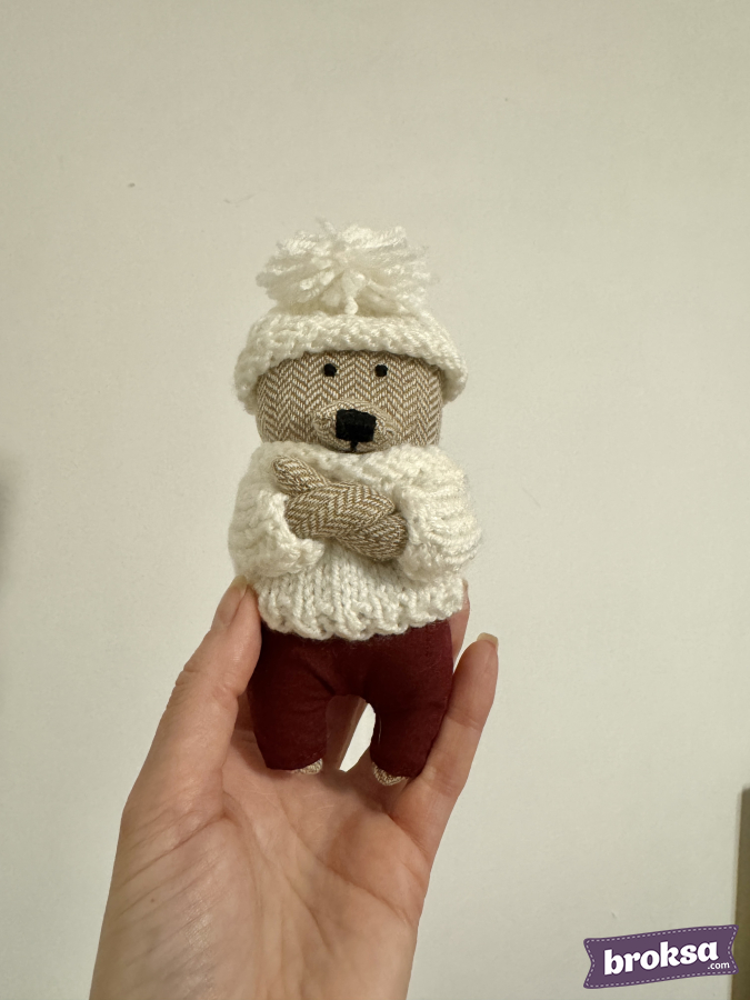 Mini osito con suéter color crema y gorrito con pompón. Cuerpo de tweed beige, pantaloncitos burdeos; el gorro es desmontable. Ojos y nariz bordados, sin plástico. Relleno hipoalergénico y suave al tacto. El trabajo artesanal cuidado convierte a este animalito en un atrezzo llamativo para sesiones de recién nacido y reborn.