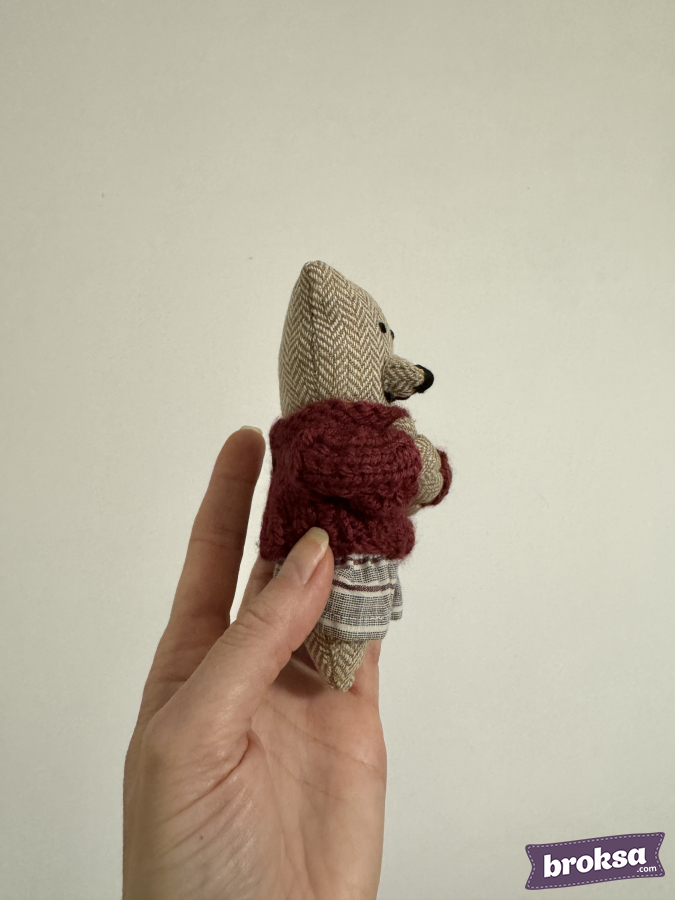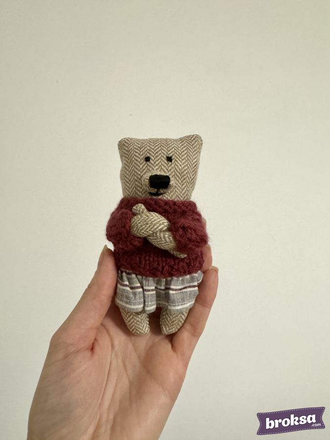 En mi taller nació una mini osa para tomas con recién nacidos y muñecas reborn. El cuerpo es de suave tela tweed con dibujo de espiga, la nariz y los ojos están bordados. Lleva un suéter tejido abultado de color burdeos y una faldita a rayas. La textura es delicada y los colores son cálidos. Es el animalito perfecto como juguete para una sesión de fotos.