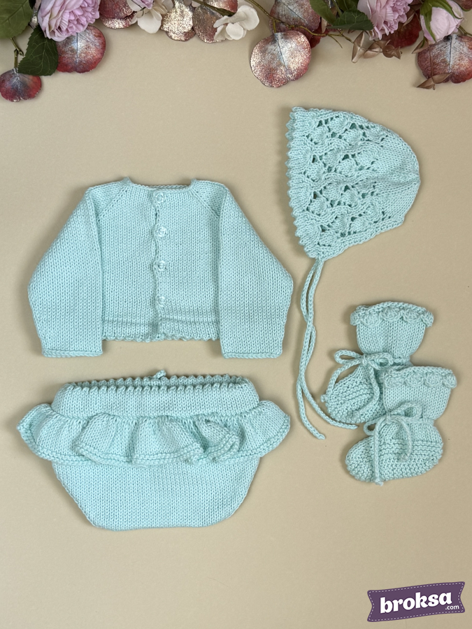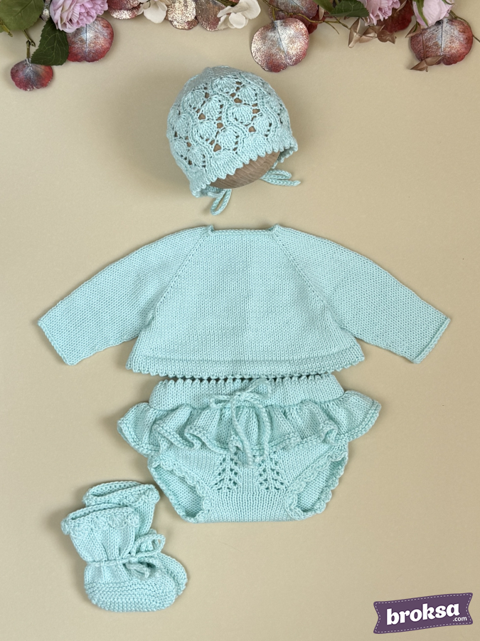 Contenido: suéter de manga larga, braguitas con volantes, gorrito, patucos con cordones
