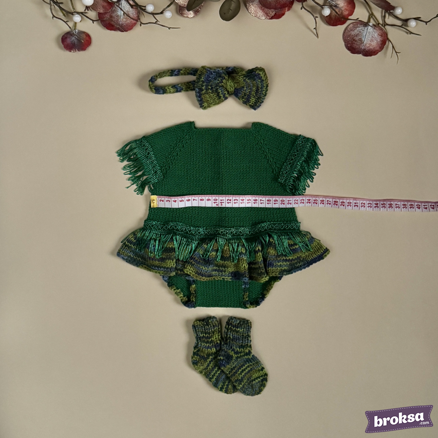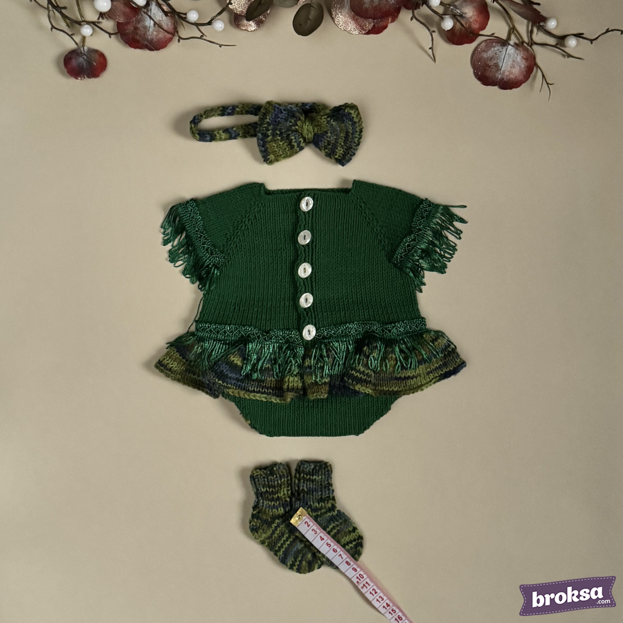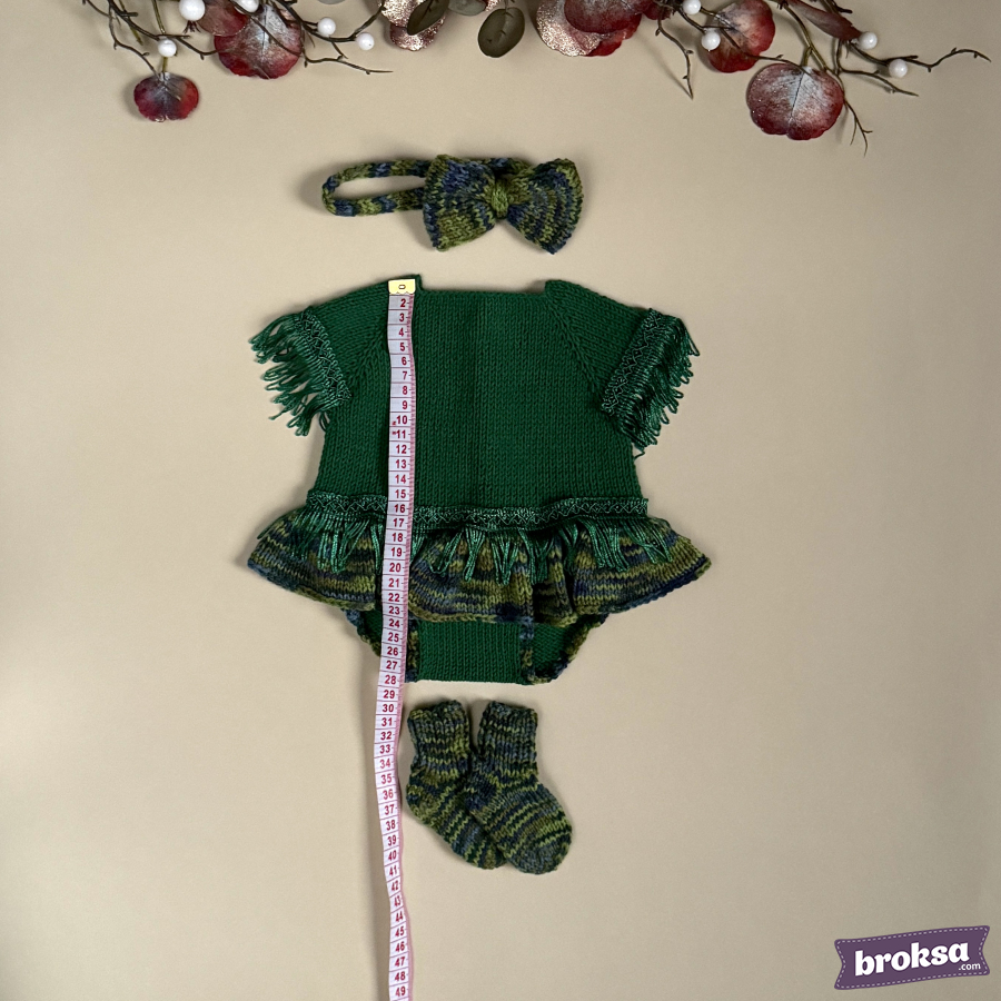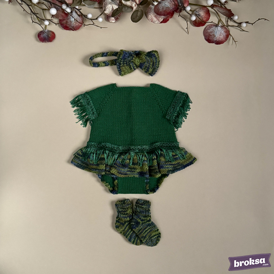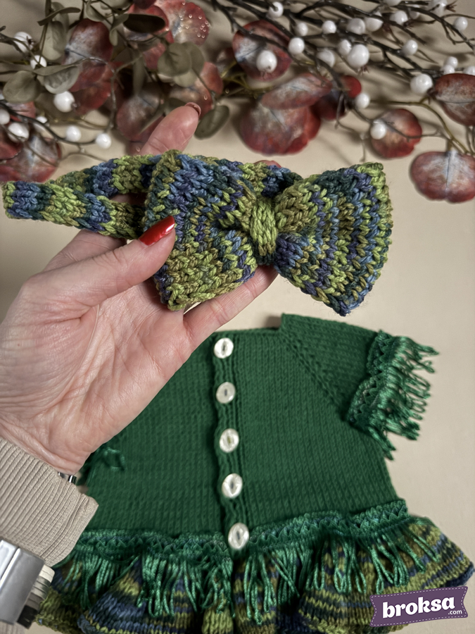 Propongo un conjunto de punto festivo en un verde intenso. Body con relieve suave, manga corta con borlas y un volante ondulado jaspeado en tonos de bosque. Lo acompañan calcetines y una diadema con lazo. El look evoca el Año Nuevo y los pinos, y se ve limpio y elegante en una muñeca de colección.