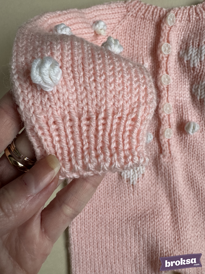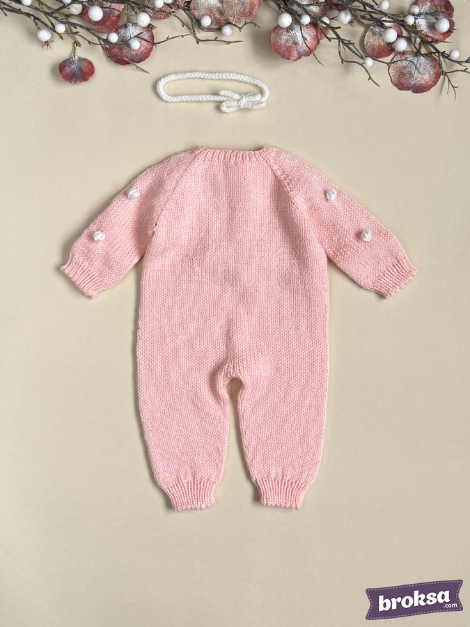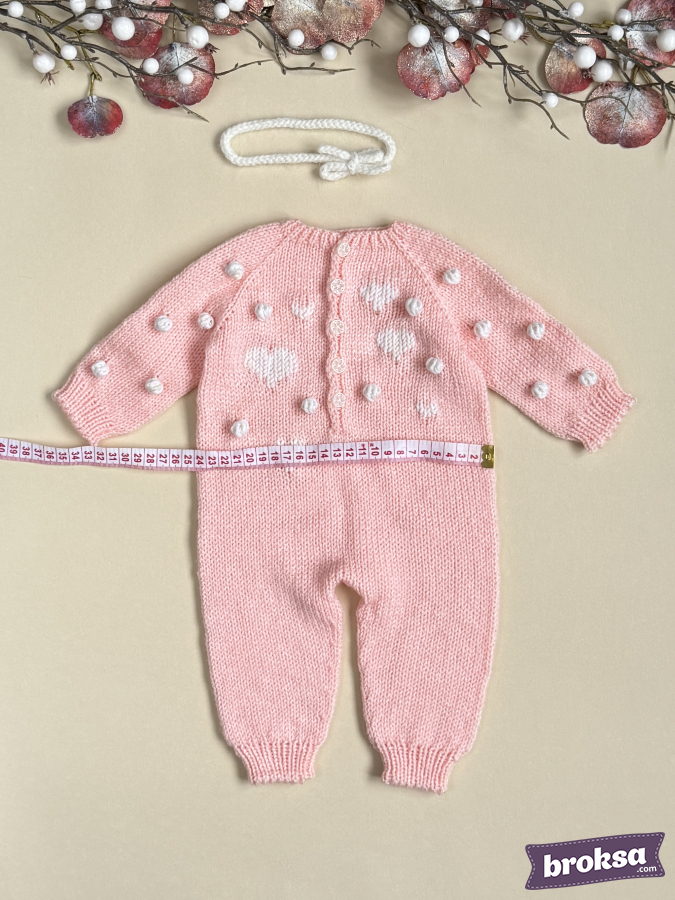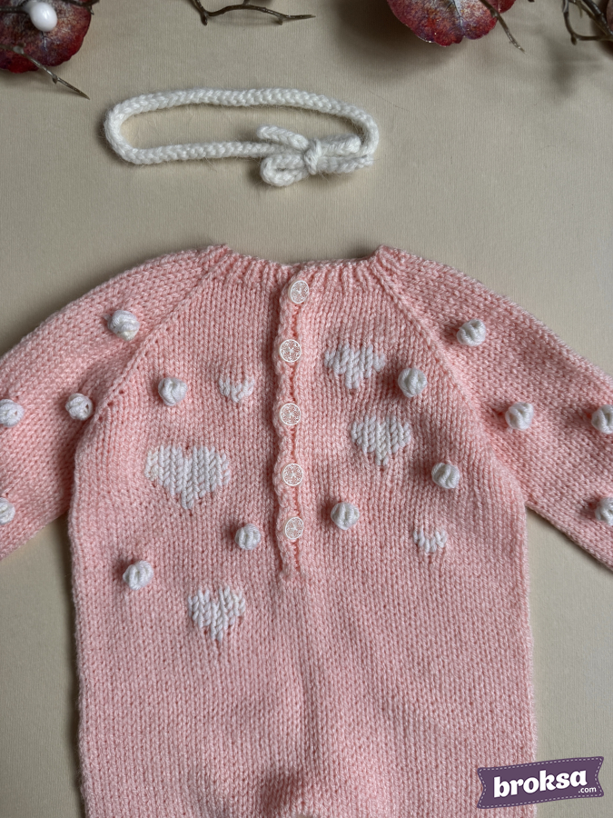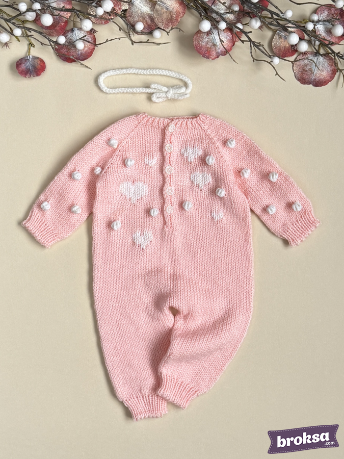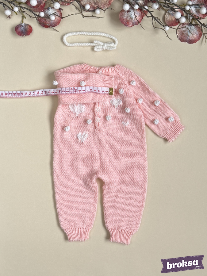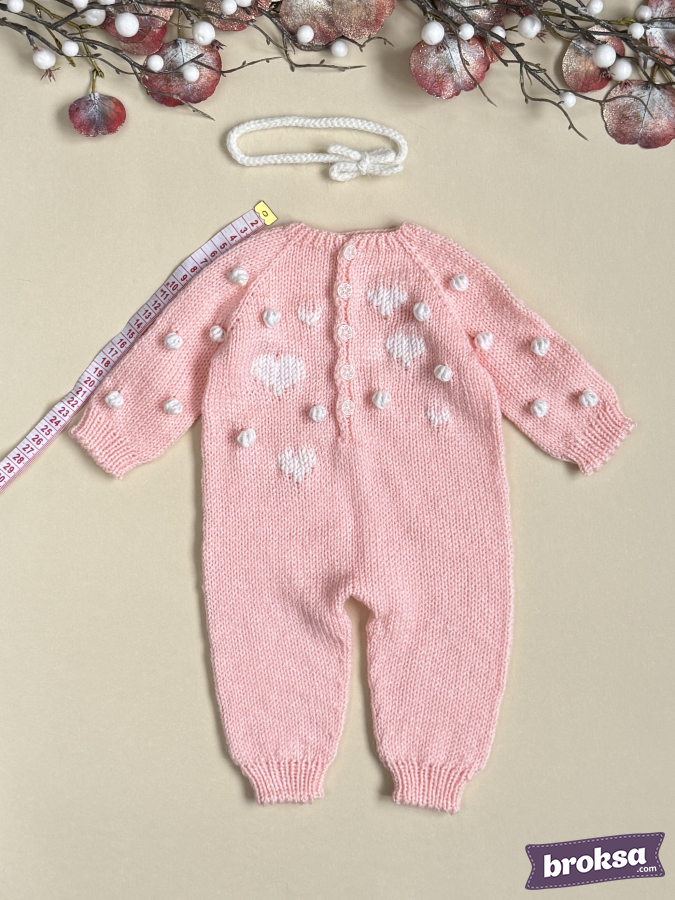 Ofrezco un mono de punto para una muñeca reborn de colección en color rosa suave. Elijo tonos y texturas delicadas para transmitir el ambiente de San Valentín. El motivo blanco de corazones y las burbujas en relieve crean una textura delicada, y los botones se ven refinados. La construcción raglán y los puños elásticos garantizan un ajuste sin pliegues, y la atención al detalle completa el look para sesiones de fotos y escaparates.