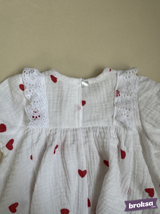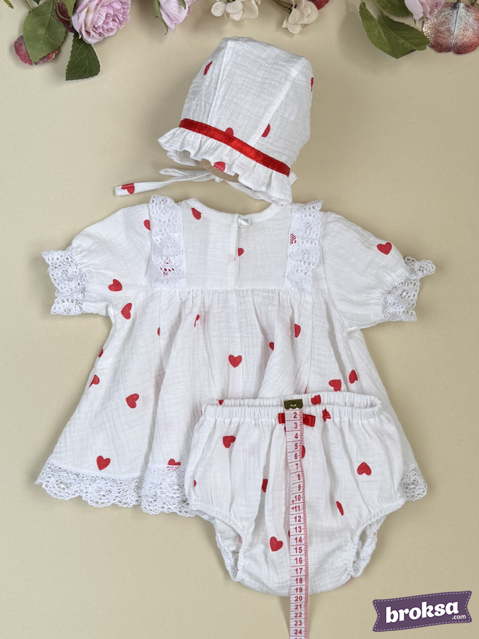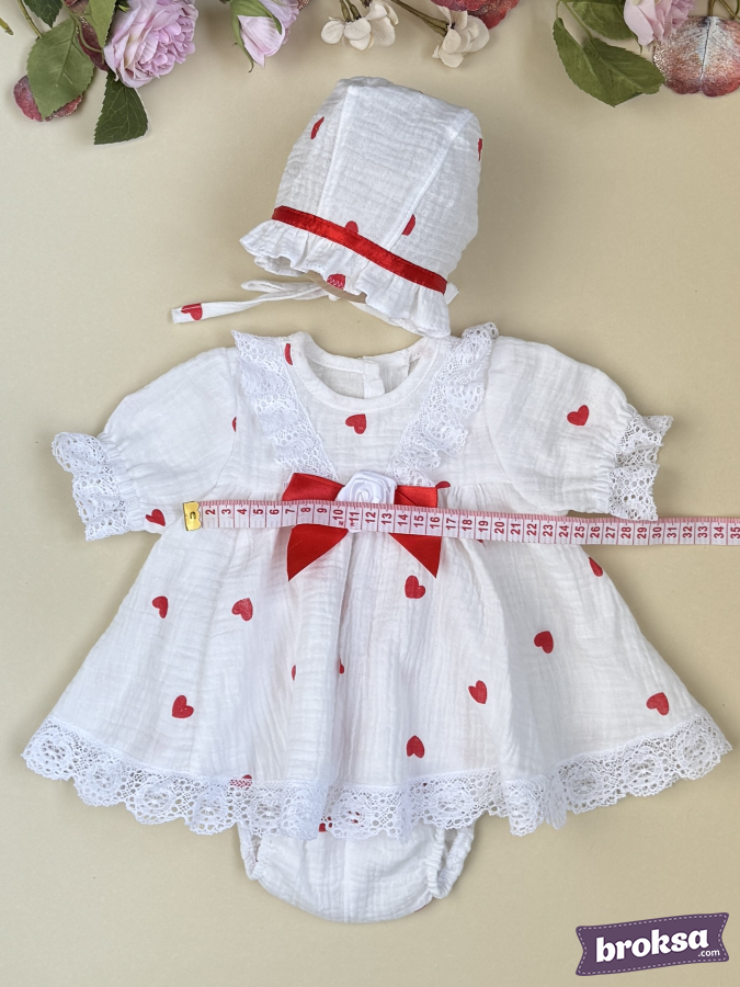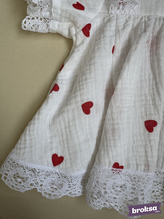 Presento el refinado conjunto de autor "Mi Corazón" — ropa cosida premium para muñecas reborn de colección. La muselina blanca pura, salpicada de pequeños corazones rojos, crea un ambiente ligero y festivo para el Día de San Valentín. La textura suave de la tela cae con delicadeza, destacando un ajuste impecable. El encaje calado de algodón en las mangas y a lo largo del bajo aporta elegancia, y el lazo central de satén rojo intenso con flor blanca acentúa la silueta. El gorrito se armoniza elegantemente con una cinta a tono, y las braguitas se ajustan con delicadeza, logrando el remate perfecto del conjunto. Es una prenda de autor exclusiva para reborns, creada con enfoque en la alta artesanía, los detalles refinados y una sensación premium de valor coleccionable.