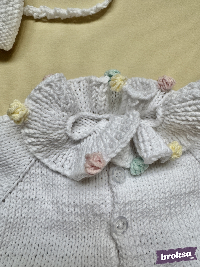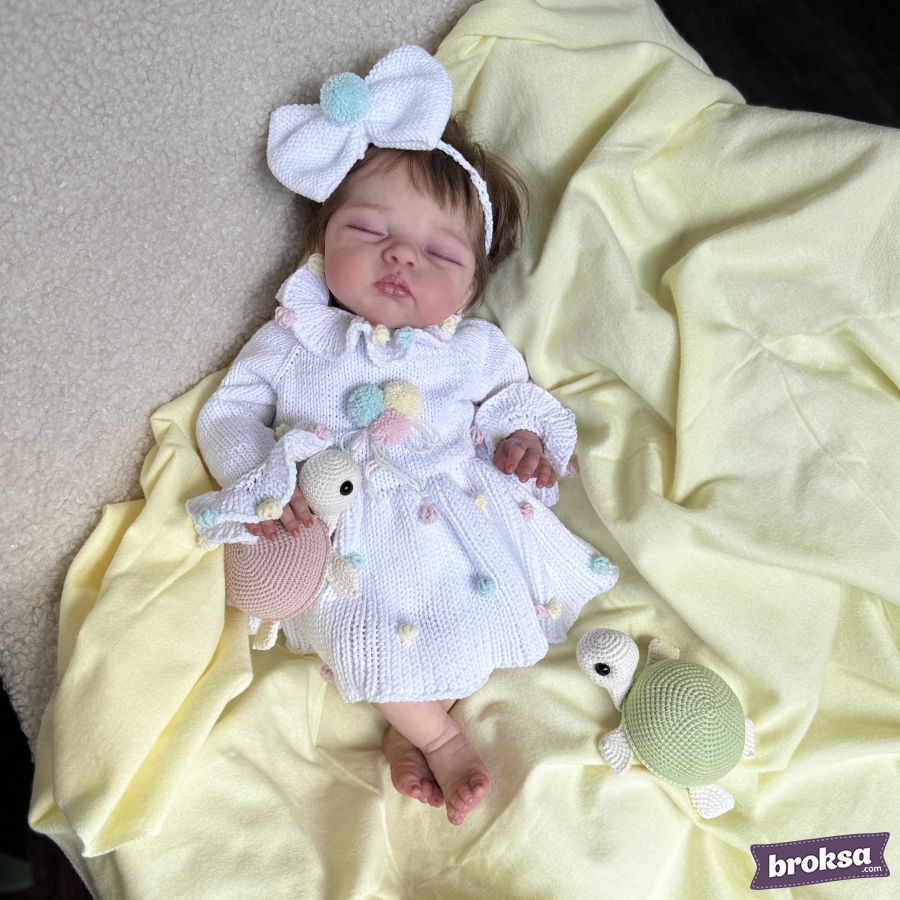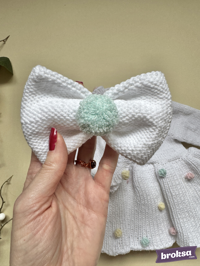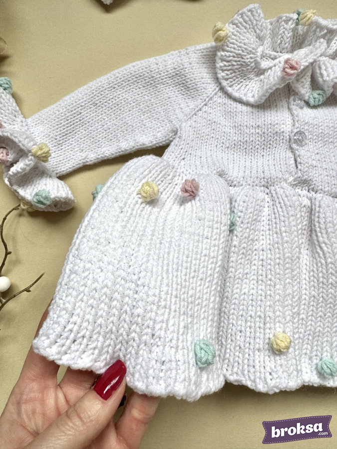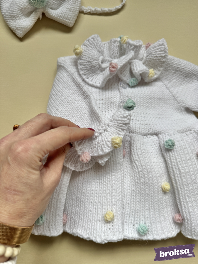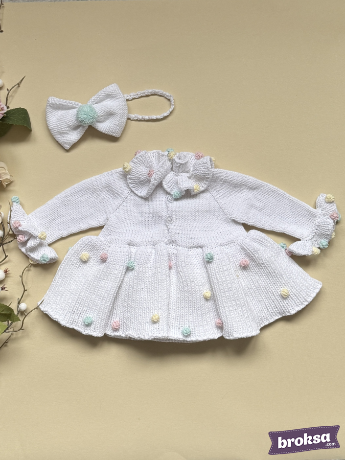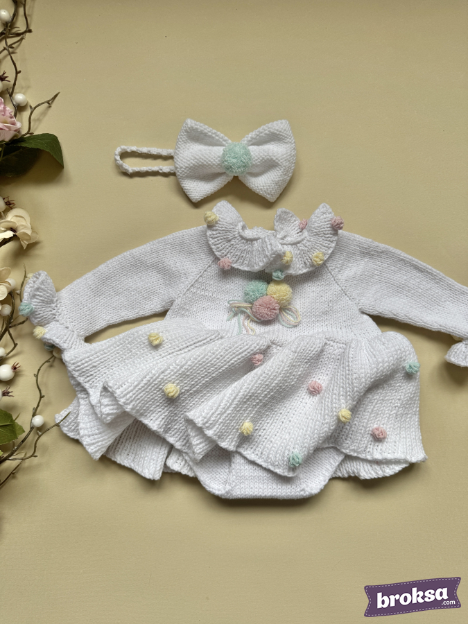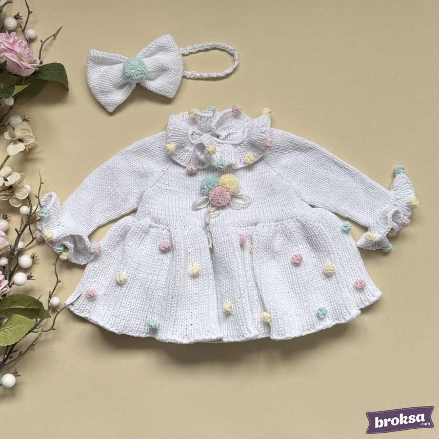Ofrezco un atuendo para muñeca reborn: un vestido tejido blanco níveo de manga larga y una diadema con lazo. Pompones esponjosos en tonos pastel—como malvavisco y helado—están salpicados por la falda, el cuello y los puños. La silueta se asienta suavemente sin pliegues innecesarios, y los detalles están acabados con cuidado. Es una prenda elegante para una muñeca de colección que hace destacar el look.