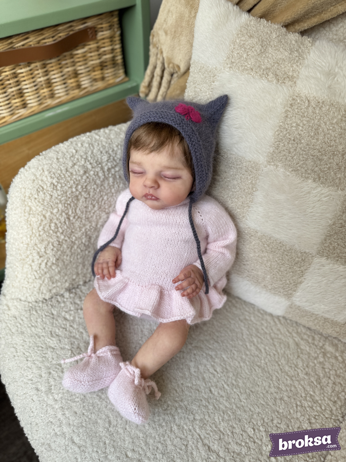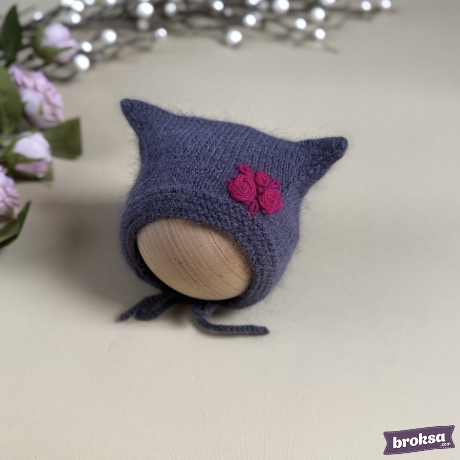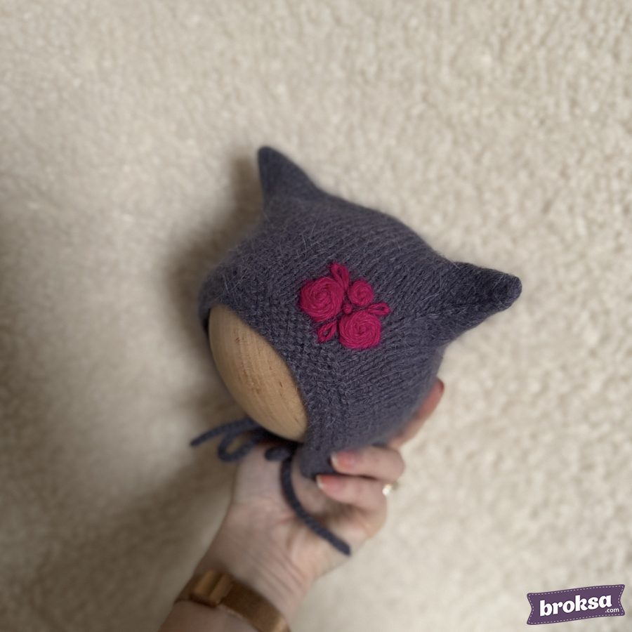 Propongo un gorrito tejido para una muñeca reborn en color ahumado. La forma con delicadas «orejitas» enmarca prolijamente el rostro; los lazos lo sujetan sin botones. El hilo aporta suavidad y un pelito delicado. Un bordado prolijo resalta la atención al detalle y añade expresividad al look.