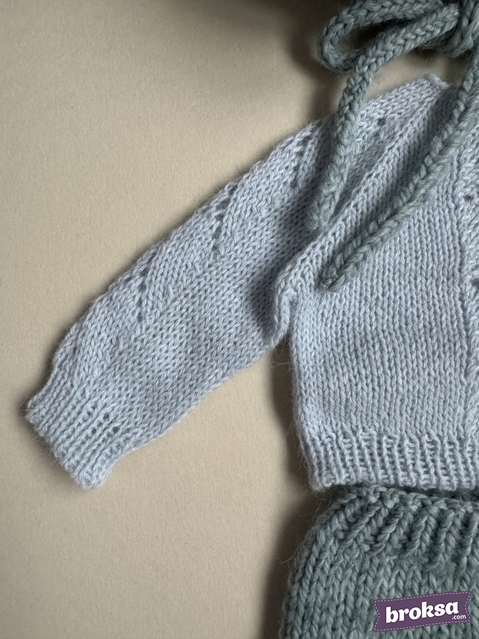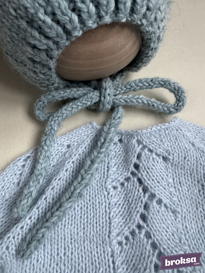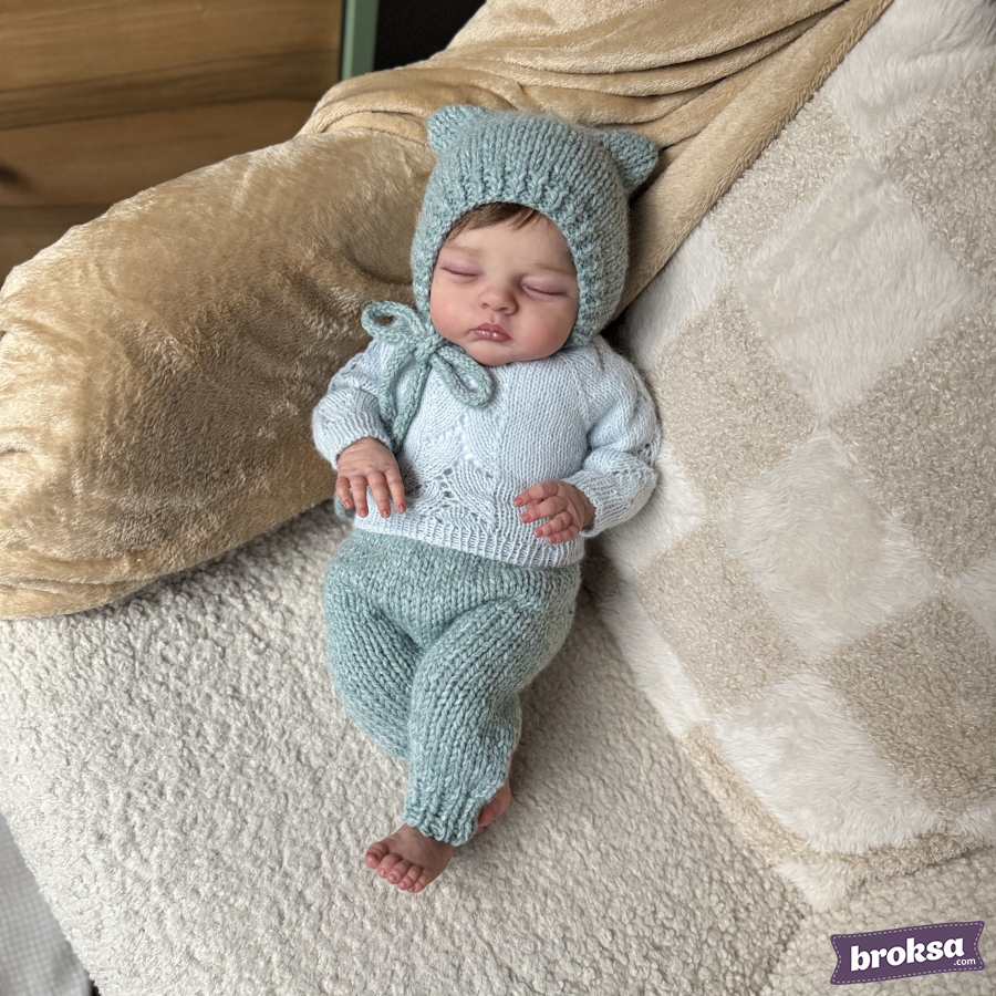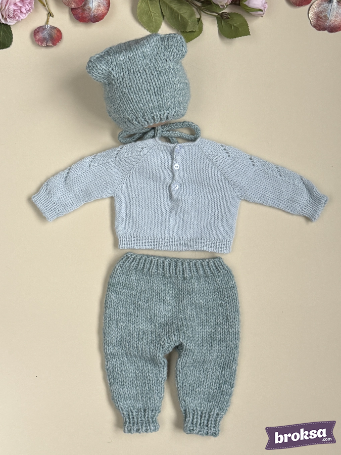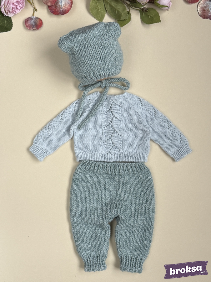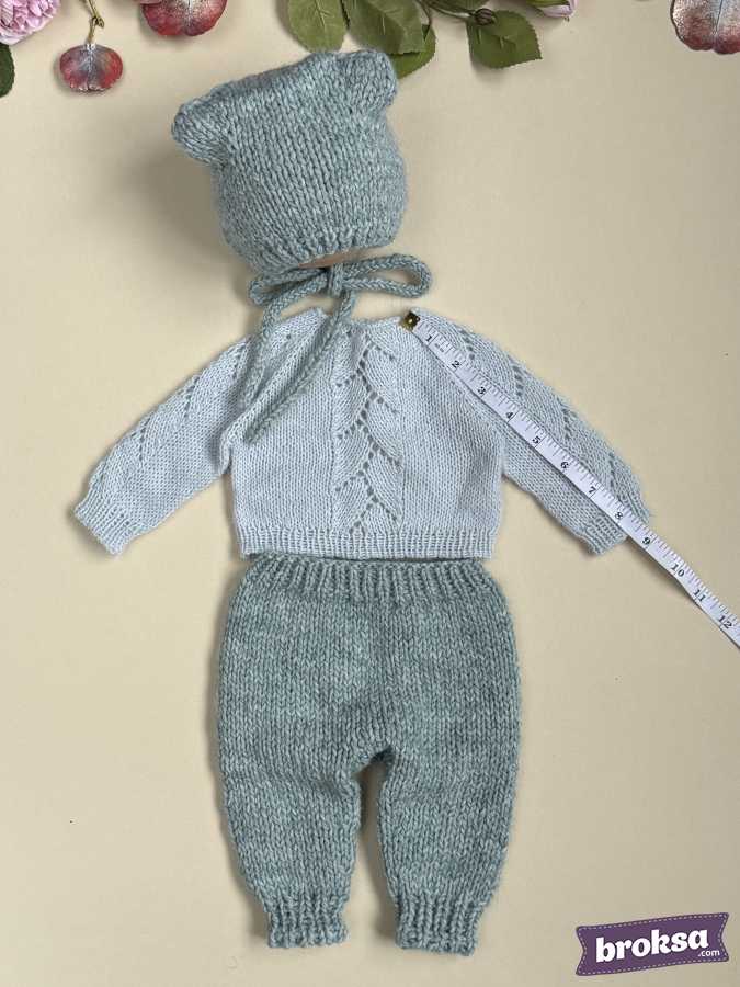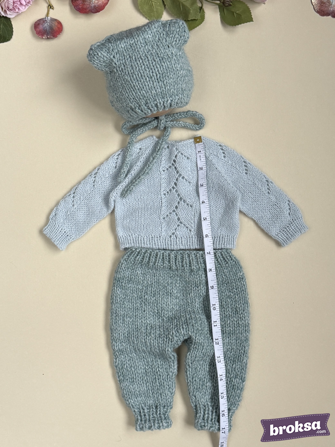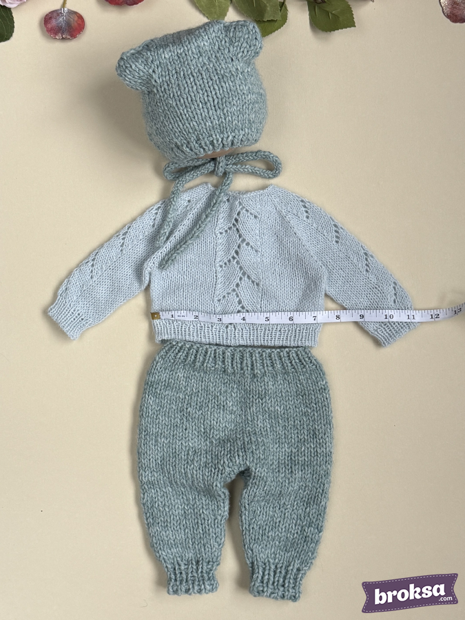 Mi conjunto para muñeca reborn en un delicado tono de salvia fría. El set incluye un suéter con un refinado motivo calado de hojas, pantaloncitos con cintura elástica y un gorrito con orejitas y cintas para atar. La textura suave aporta una elegancia discreta. Selecciono hilado de alta calidad, y los bordes definidos y las proporciones bien pensadas evidencian mi atención al detalle.