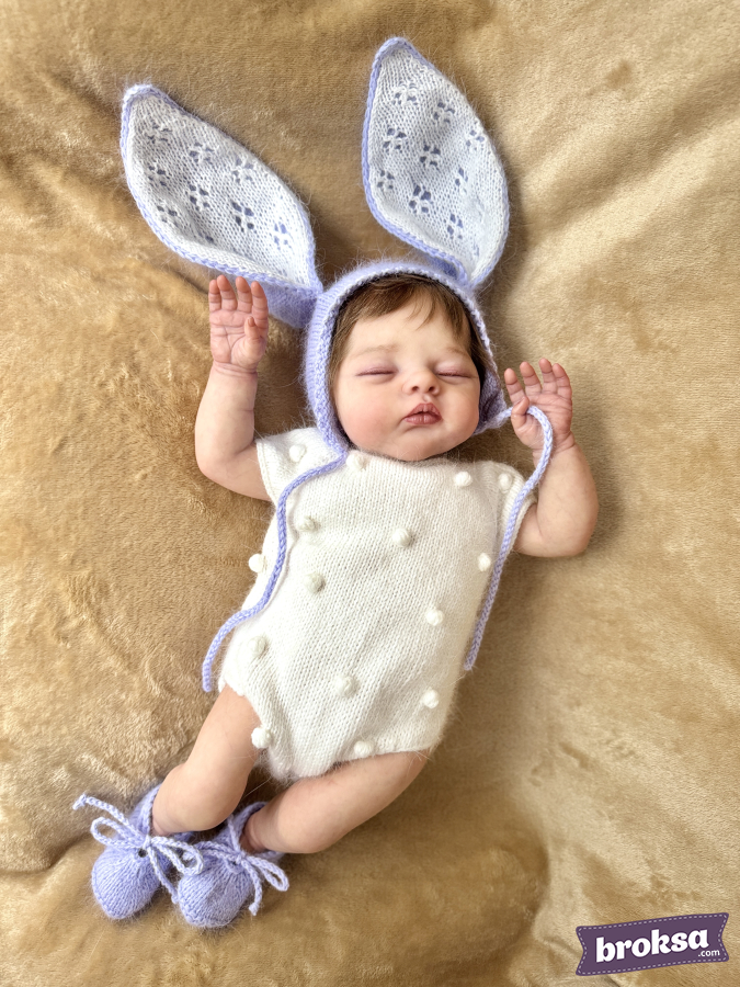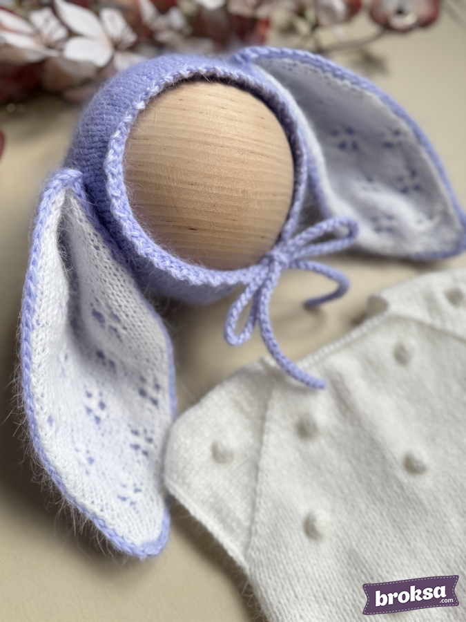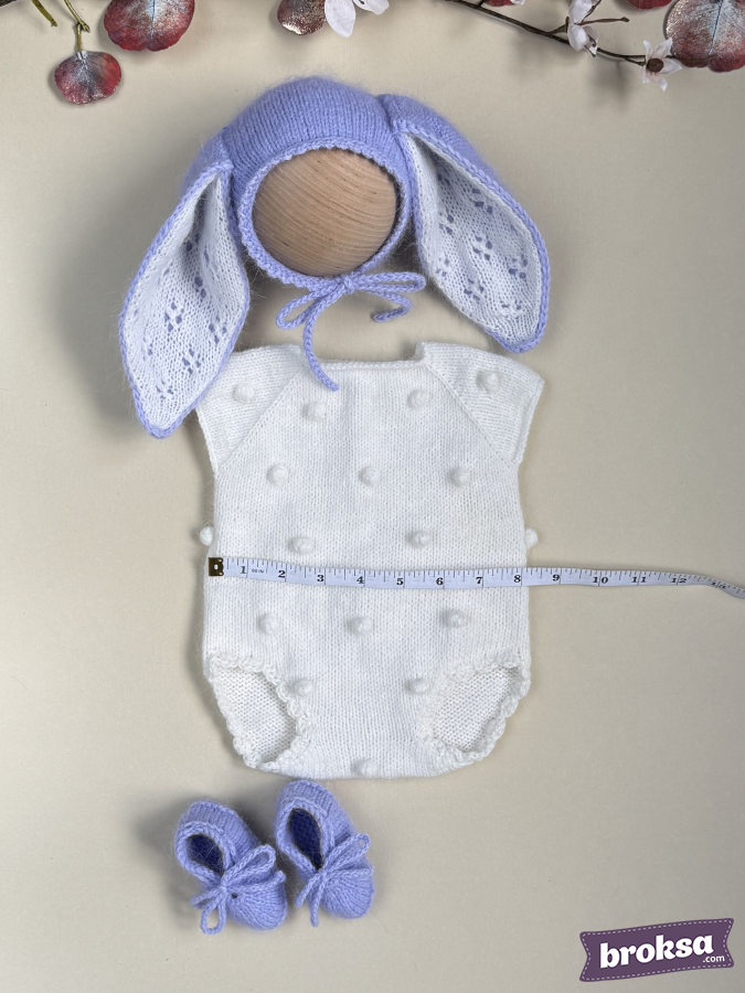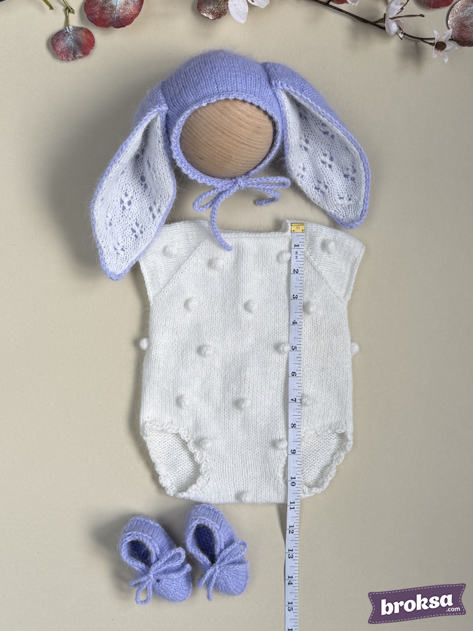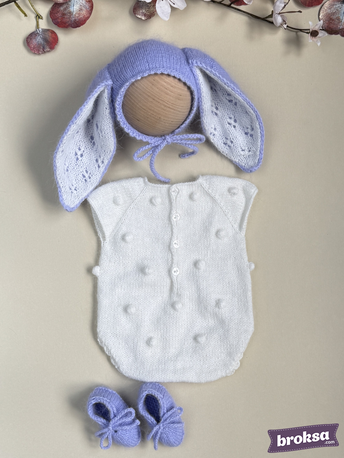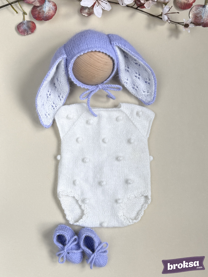 Propongo un delicado conjunto tejido para muñeca reborn en una paleta lavanda y blanca. El body blanco con burbujas y bordes ondulados se ve pulcro y sobrio. La capota lavanda con orejas largas tiene una parte interior calada, y la acompañan unos patucos suaves con cordones. Hilo de alta calidad, un look fotogénico y equilibrado. El ajuste perfecto ofrece una silueta ordenada, y la atención al detalle se aprecia en los bordes parejos, los cordones delicados y los tonos coordinados.